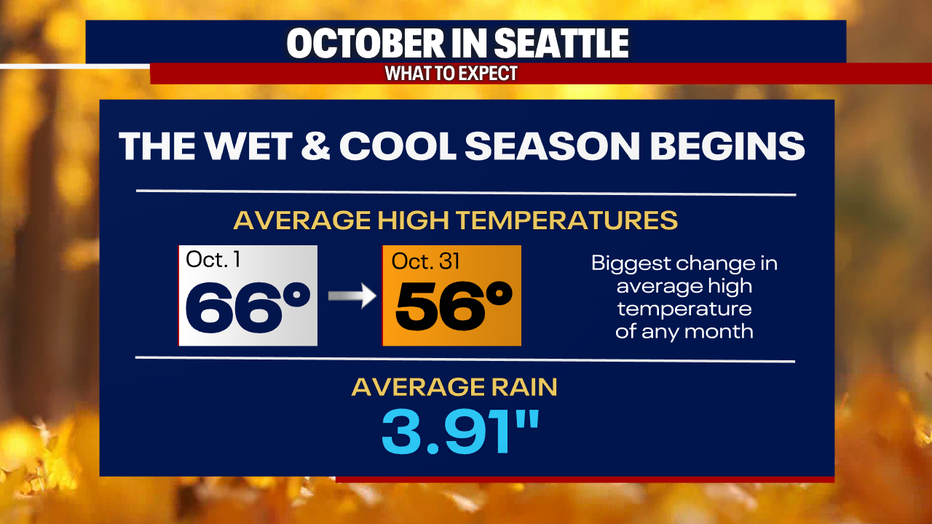 The wet and cool season is here, with average high temperatures dropping ten degrees in the month of October. That's the biggest change in average high temperature of any month of the year in Seattle. October also averages almost four inches of rain. That's more than double September's average.