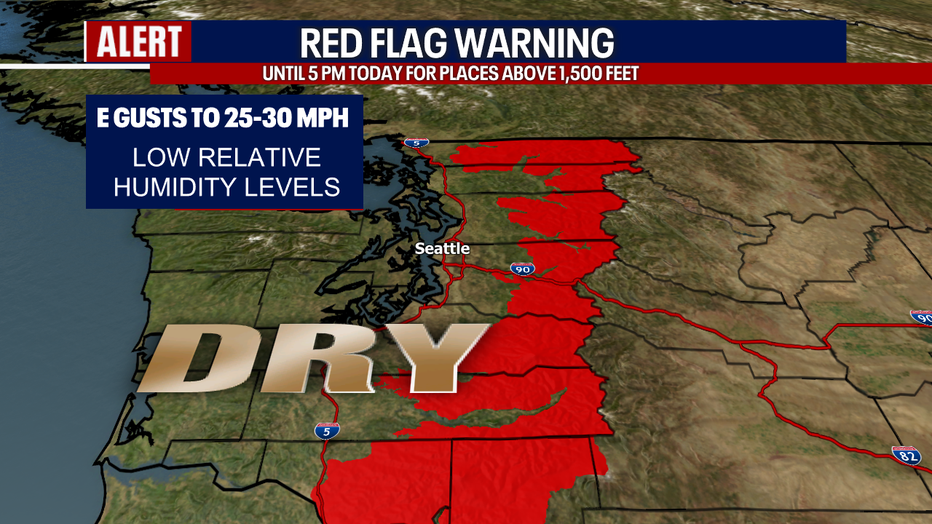 A Red Flag Warning is posted for the Cascades above 1,500 feet through 5 p.m. today. East gusts of 25-30 mph and low relative humidity levels will make for dangerous conditions. Any fires that start today have the potential of spreading faster than usual.