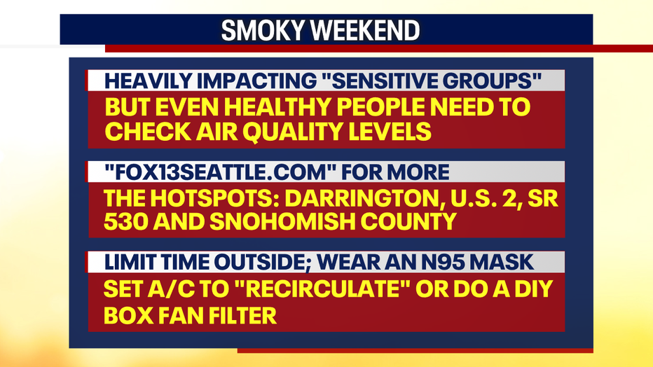 An Air Quality Alert remains in effect through 11 a.m. Monday. Sensitive groups (kids, seniors, pregnant people, those with respiratory issues, etc.) need to limit time outside today. In conditions like this, experts recommend wearing an N95 mask if you do have to be outside. The areas with the worst air quality look to be Darrington, Highway Two, SR 530 and Snohomish County. King, Skagit and Whatcom Counties could also see pockets of thick smoke.