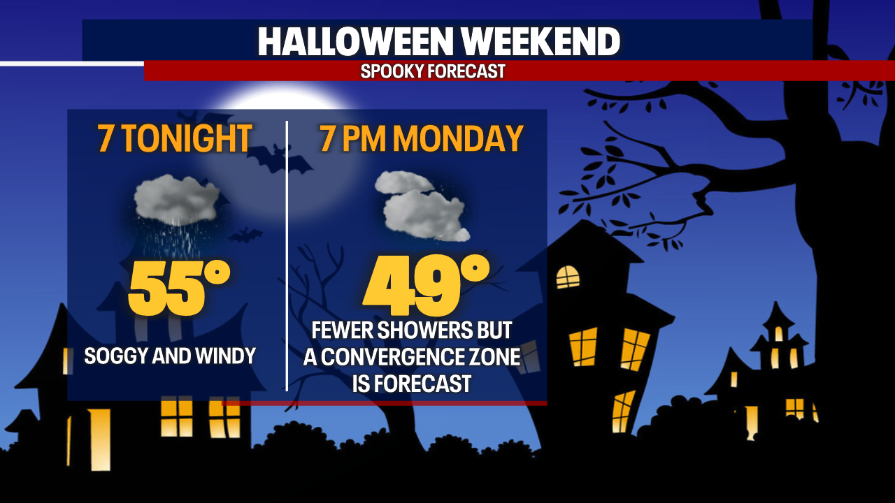 The latest forecast models are pulling back on rain chances for Halloween which is great news for kids and trick-or-treaters! Keep in mind: a convergence zone in parts of Eastern Skagit, King and Snohomish Counties could keep rain ongoing into at least late Monday. Make sure to check back with our forecast team throughout the day tomorrow as we monitor the showers. I'd recommend dressing the kids in warm layers as they go door-to-door. It wouldn't be a bad idea to bring an umbrella or rain jacket along just in case.