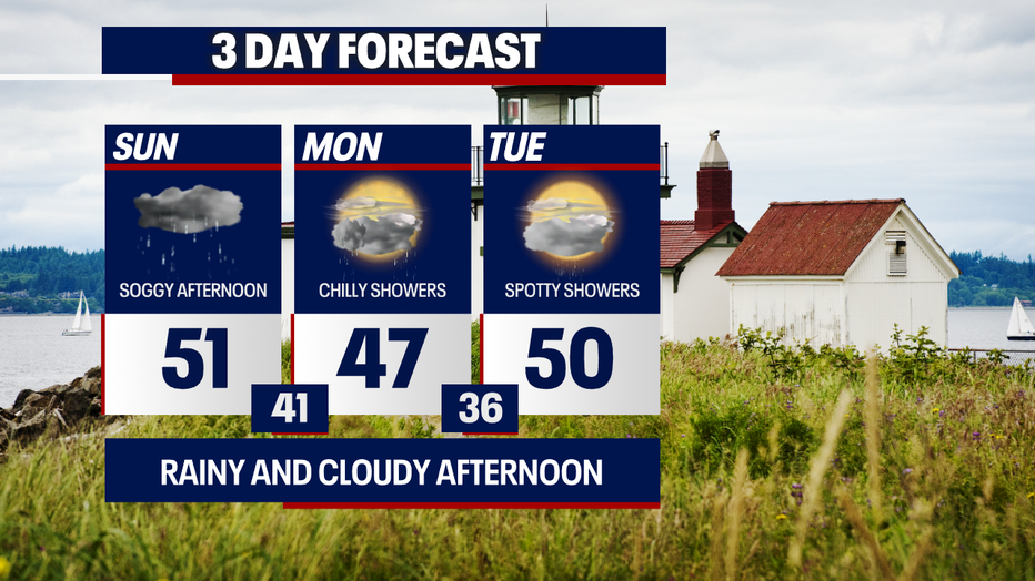 Highs today will lift to either side of 50 degrees; however, the clouds and rain will make temperatures feel even cooler. As rain fills in the I-5 corridor later today, driving around Western Washington could be tricky with lowered visibility and slick roads.