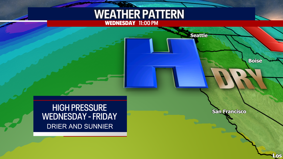 High pressure becomes more pronounced Wednesday and Thursday, blocking out any incoming storm systems. This two-day stretch will be dry and quiet with plenty of sunshine.