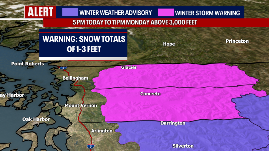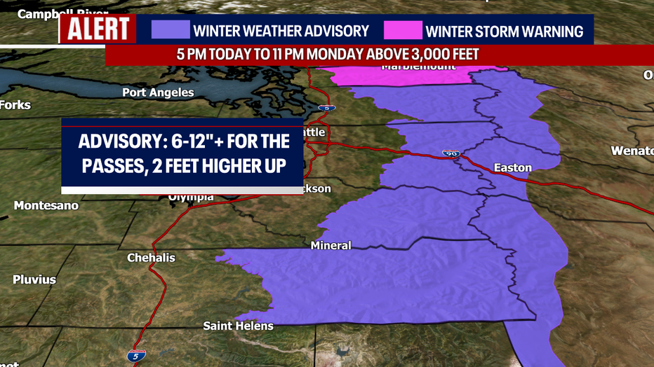 Over the Cascades, several alerts are in effect from 5 tonight to 11 p.m. Monday. A Winter Storm Warning remains in place for the North Cascades where one to three feet of snow could pile up.