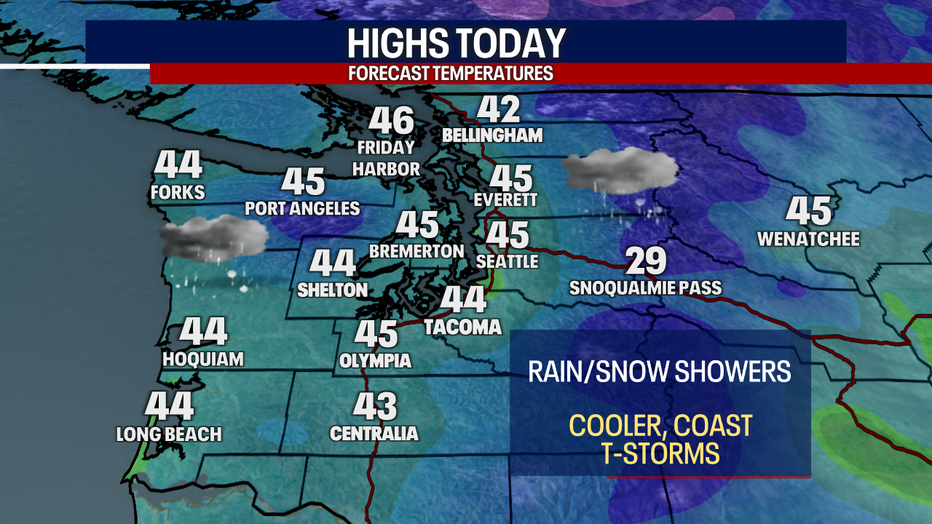 SEATTLE - It was an eventful morning for a few backyards in the North Sound: places like Whidbey Island, Mount Vernon, Bellingham and Stanwood experienced some light snow. For the rest of the day today, we can't rule out an additional rain/snow mix. For the most part, this will be focused in Southwest Washington.