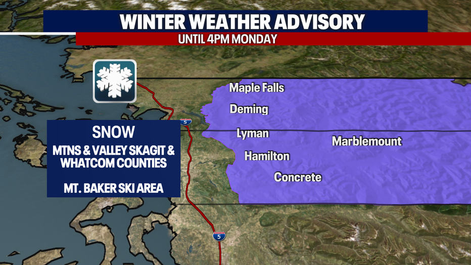 There's still a Winter Weather Advisory until 4 p.m. for eastern Whatcom and Skagit Counties. There's a similar alert in place for the Willapa Hills in Southwest Washington this morning.