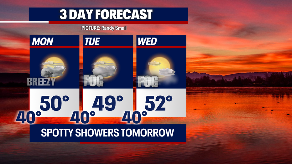 SEATTLE - What a day! The warmth of the sun felt magical as highs peaked around average (50 degrees). The dry weather will briefly be put on hold, as we get ready for a weak system to trigger spotty showers. We'll have to dodge some patchy fog until it arrives. The showers will kick up early tomorrow morning along with the wind speeds.