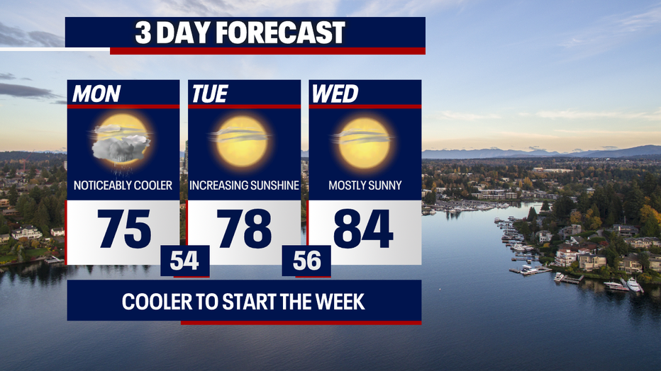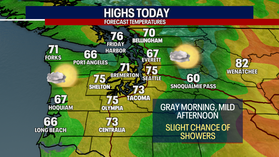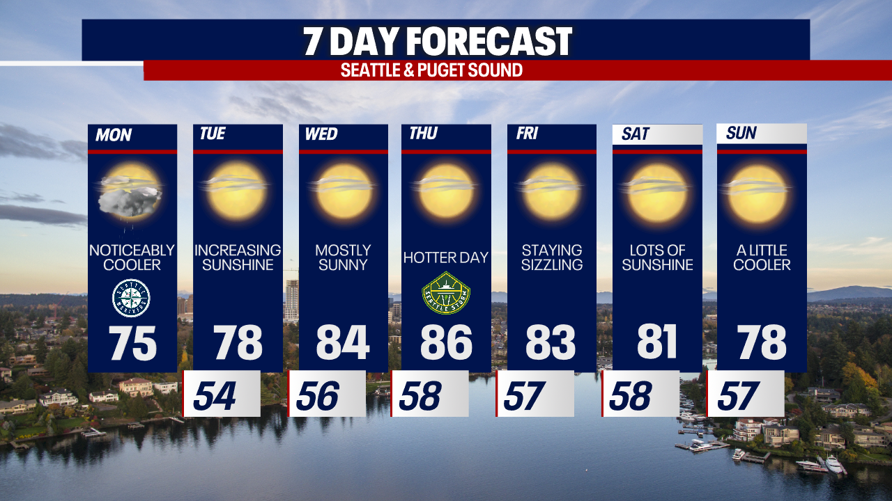 Seattle weather: Spotty showers today, mid 80s by Wednesday