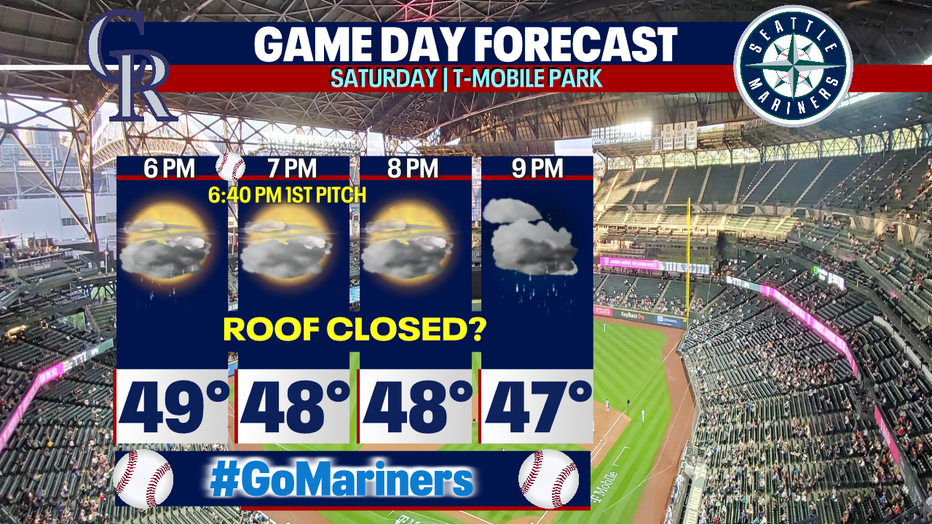 T-Mobile Park might see a roof closure as showers will roll through during the game against the Rockies. Dress warm as temps cool into the upper 40s the 6:40 p.m. first pitch.