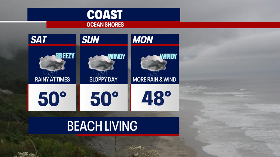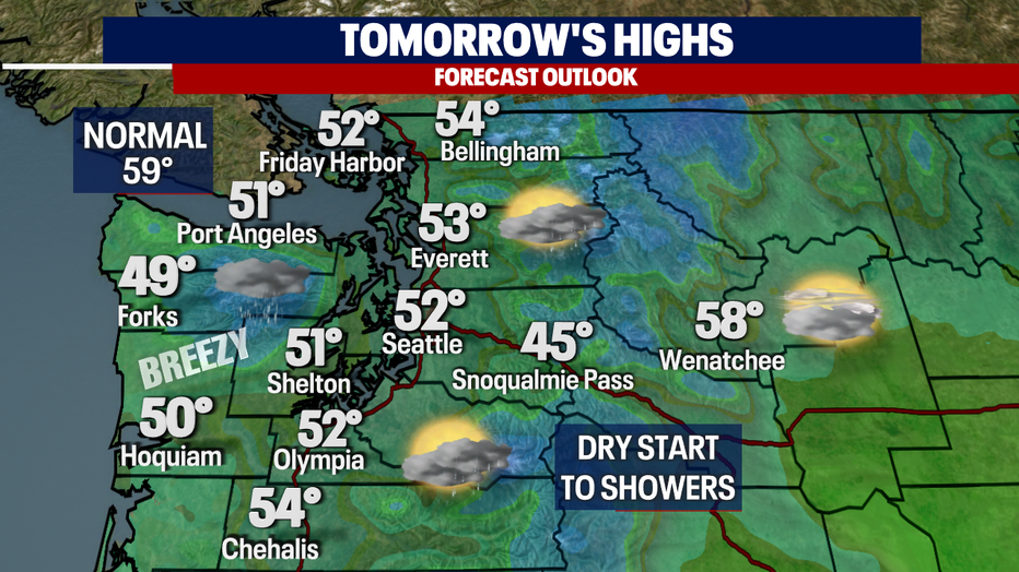 The coast will become wet and windy first with the heaviest showers moving over Puget Sound by midday. South winds are breezy for Seattle too. Highs cool into the upper 40s.