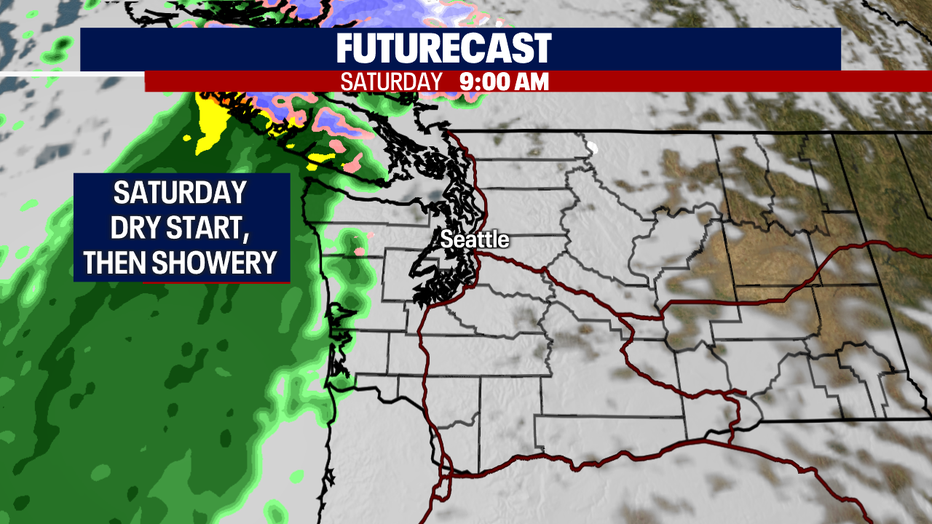 Showers hit the coast first Saturday morning as a front pushes onshore. Showers march into Western WA by Saturday afternoon.