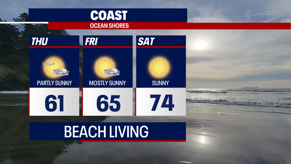 Highs Thursday will warm a few degrees into the mid 70s for folks south of Seattle with cooler highs at the coast and the North Sound.