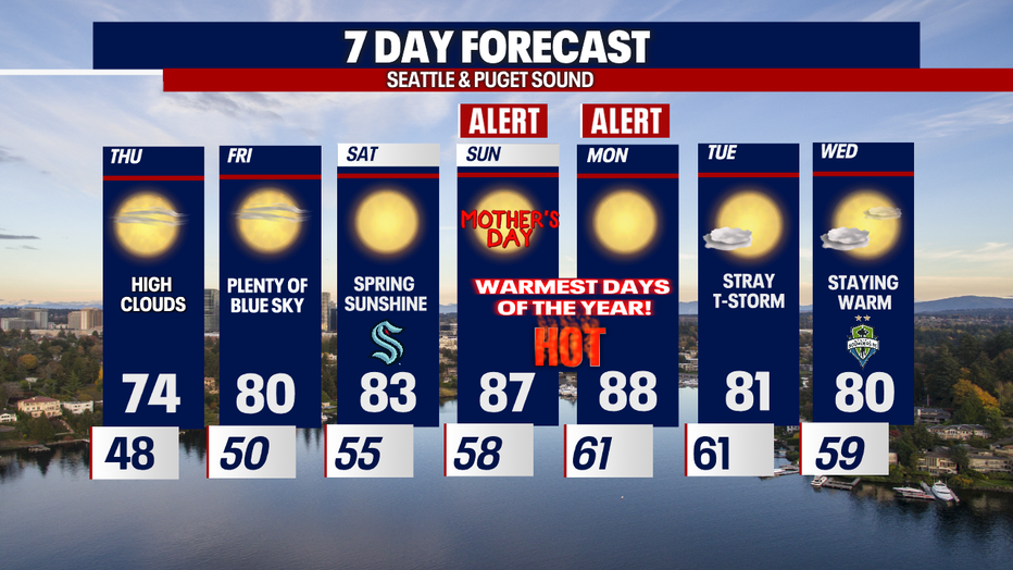 Just look at this temperature trend into next week. Highs are near 90 by Monday! Plan for the heat when thinking about Mother's Day festivities. And don't forget to use sunblock to protect our sun deprived NW skin.