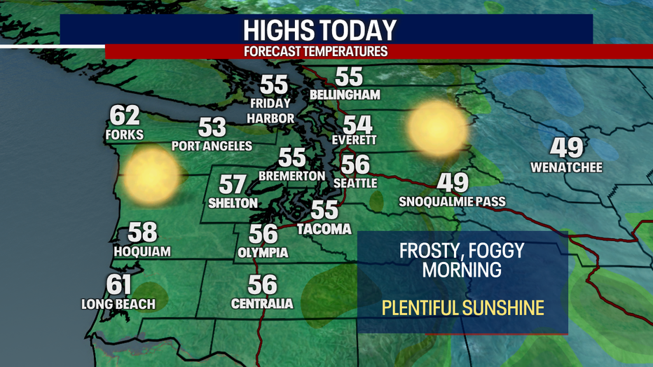 Other than some morning clouds in the south sound, most areas woke up to sunshine Monday. Expect lots of sunshine for everyone in Western Washington today with high temperatures in the mid 50s.