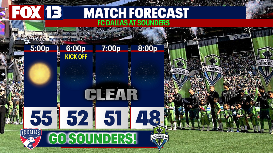 If you're heading to the Sounders playoff match against FC Dallas tonight, temps will be in the 50s at kickoff, but will drop into the 40s as the sun goes down. Make sure you bundle up!