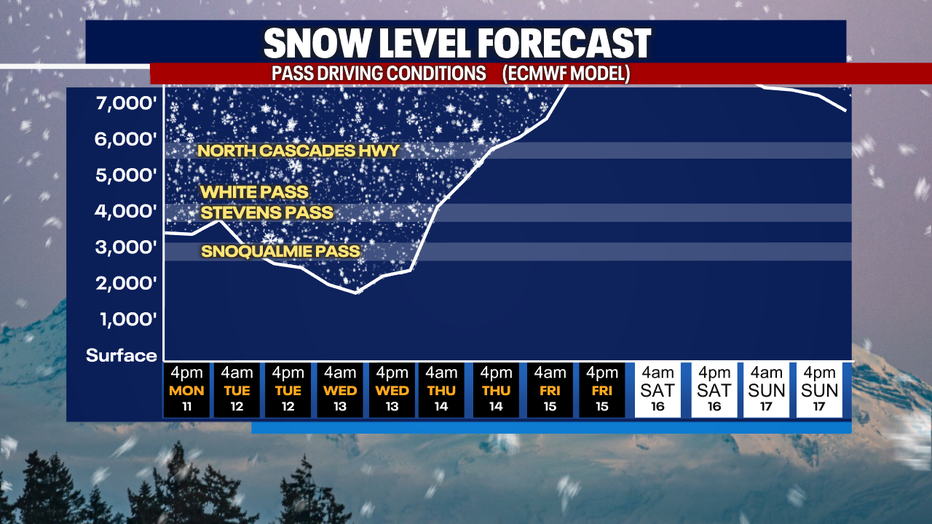 Snow levels will stay around 3,000 feet Monday and Tuesday. This storm will bring 6 to 12 inches of fresh powder to the passes, with one to two feet or more possible in the northern Washington Cascades. Any snow in the mountains is a welcome sight this time of year.