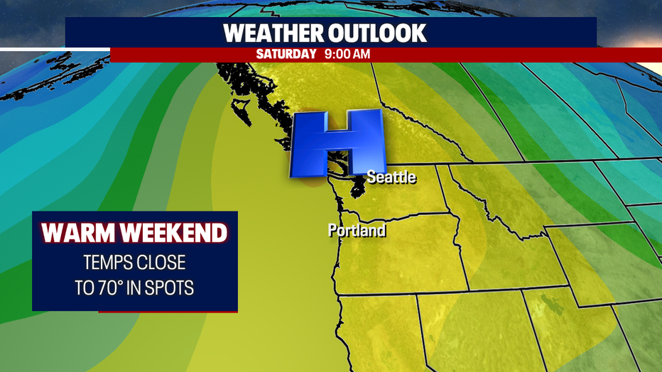 A ridge of high pressure will build over the Pacific Northwest later this week into St. Patrick's Day weekend. As the ridge amplifies over Washington on Saturday, temps will soar into the mid to upper 60s with lots of sunshine. There could even be a few spots that hit 70 degrees this weekend.