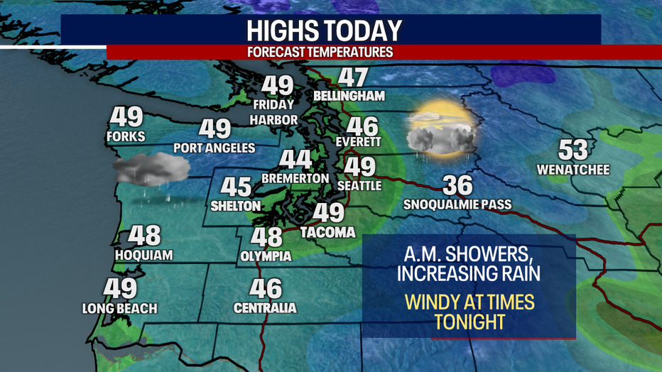Most of the daylight hours will feature on and off showers in the Puget Sound area with mostly cloudy skies. High temperatures will remain cool today, in the mid to upper 40s.