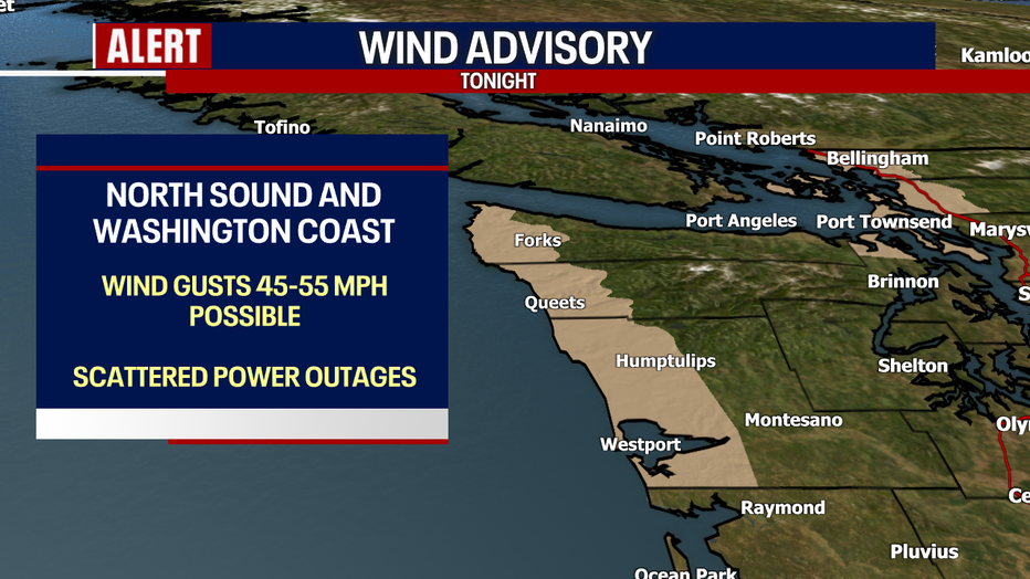 Along with heavy rain later this evening, gusty winds will develop in Western Washington. The north Puget Sound and Washington Coast are under a Wind Advisory with gusts up to 45-55 mph possible tonight. All other areas of the central and south sound will also be gusty at times. The strongest wind will develop in the Puget Sound area between 8:00 PM and 2:00 AM. Scattered power outages are possible.