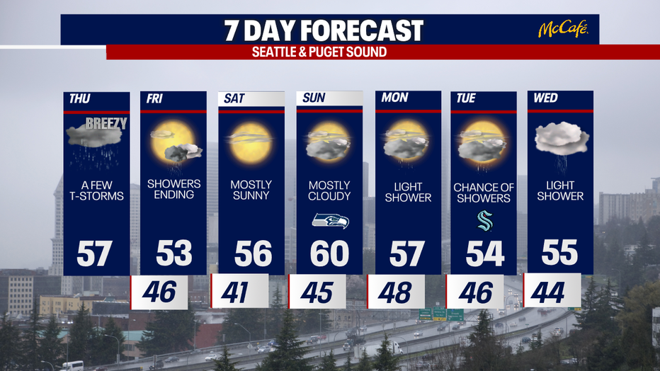 SEATTLE - Thursday will be another active weather day across Western Washington as the next system takes aim with gusty wind, high elevation snow, rain, and thunderstorms.