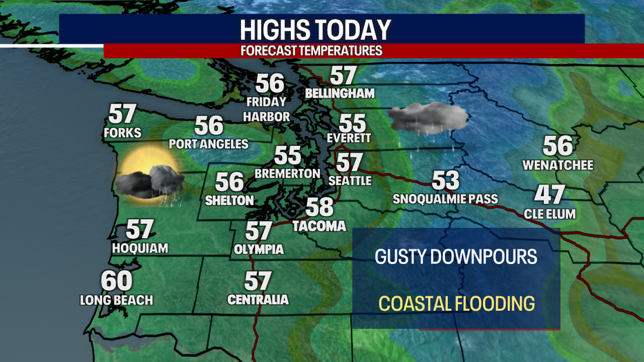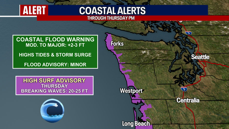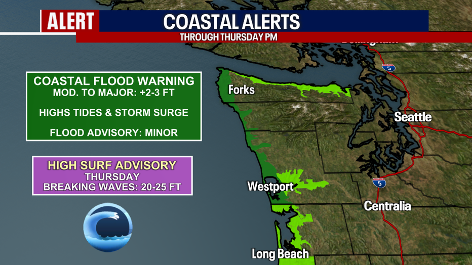 Coastal flooding and high surf will also be an issue today along the Washington Coast. High surf and big waves will likely enhance coastal flooding impacts with seas of up to 20 to 25 feet.