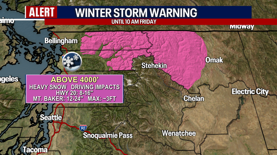 A Winter Storm Warning is in effect for the northern Washington Cascades. 1 to 2 feet of snow is possible around Mt. Baker.