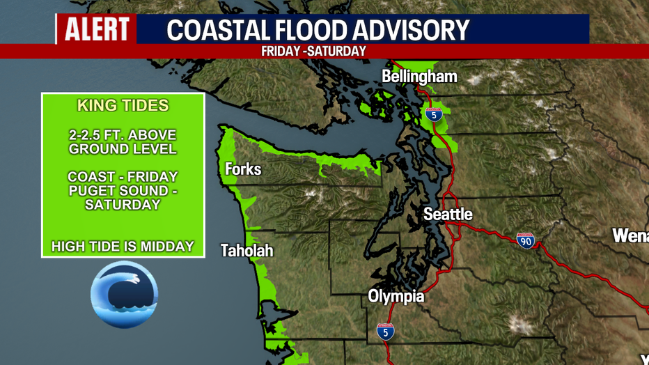 A Coastal Flood Advisory is in effect from 4 a.m. to 10 a.m. Saturday for parts of Whatcom, Skagit and Snohomish Counties for minor flooding along the coast. Inundation of around two feet above ground level is possible.