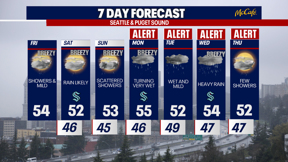Friday will be mild, reaching the mid to low 50s as another round of showers moves through Western Washington. Rain will be lighter for the lowlands, but heavier amounts for the coast and mountains.