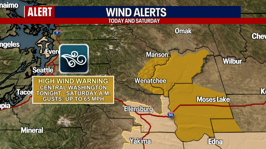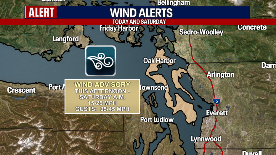 Moderately strong winds are forecast in Island County today: a Wind Advisory is in effect from 1 p.m. today to 7 a.m. Saturday for gusts to 45 mph. In Eastern Washington, more foreseeable winds are anticipated. A High Wind Warning will run from 7 tonight to 7 a.m. Saturday for gusts of 50-60 mph.
