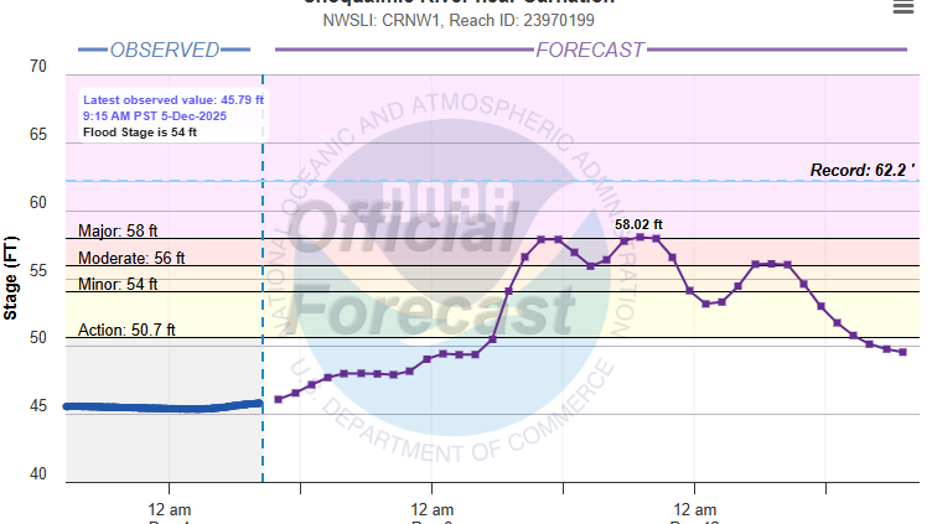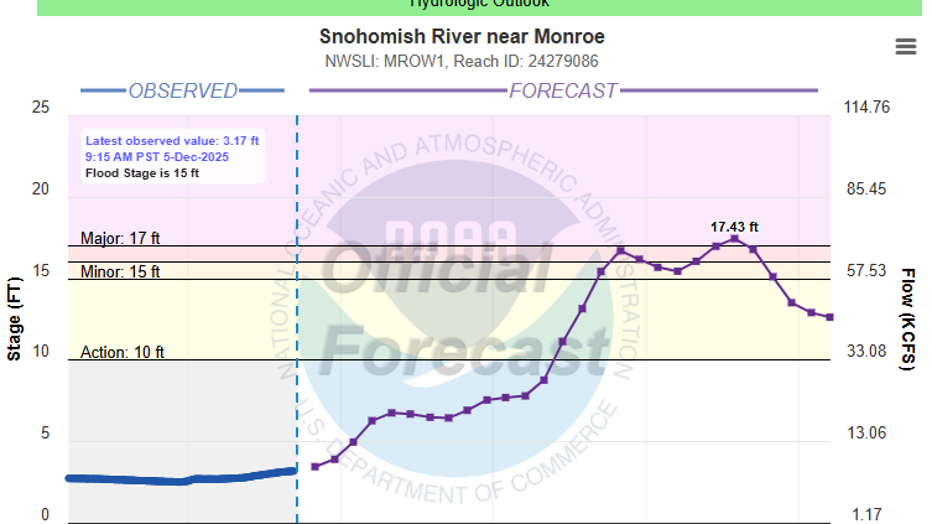 The Snoqualmie River near Carnation and Snohomish River near Monroe are forecast to reach "major" flood stage next week. Rivers will likely crest Wednesday and Thursday.