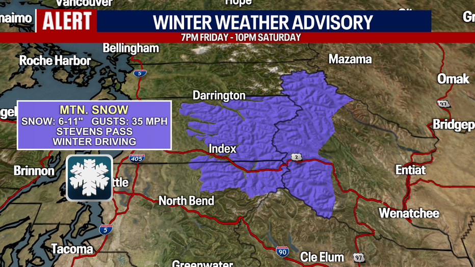 A Winter Weather Advisory will be in effect for Stevens Pass from 7 tonight to 10 p.m. on Saturday for snow accumulations of six to 11 inches. Winds could gust as high as 35 mph.