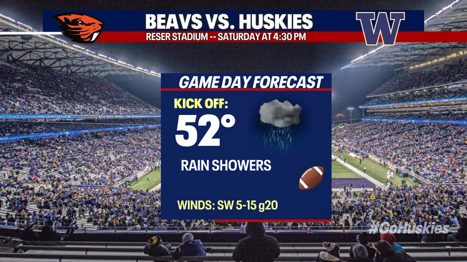 Saturday, the Washington Huskies and Oregon State Beavers will play in Corvallis, Oregon. It's going to be a wet game with on and off rain showers and a breezy second half.
