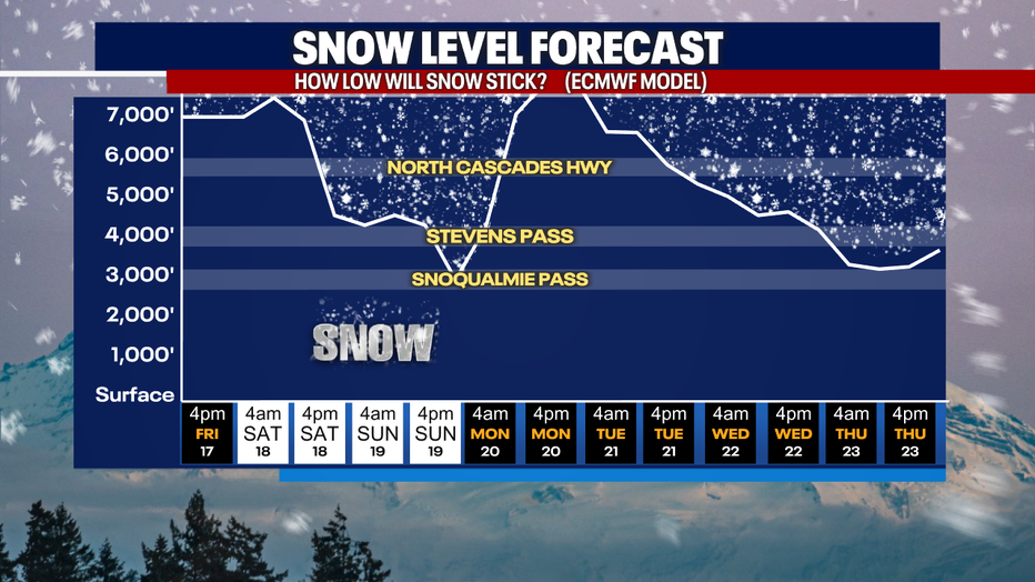 Snow levels will also drop heading into Sunday. Stevens, White, and Washington passes could see three to six inches of snow by the end of the day Sunday, while Snoqualmie Pass will likely just see cold rain.