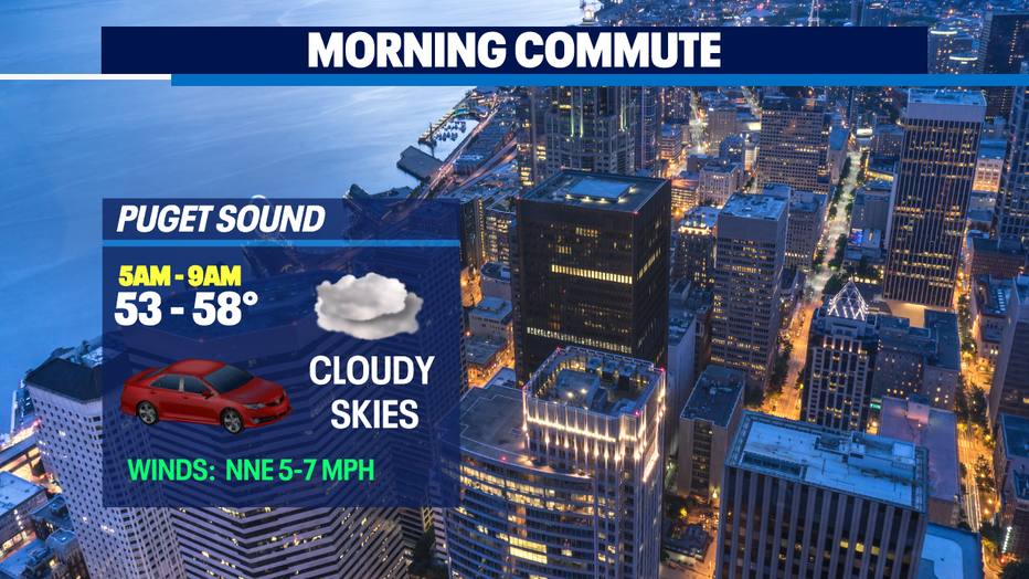 Skies are mostly cloudy as we get going during the Wednesday morning commute. We will start to clear out by mid-day for a really nice afternoon. We won't rule out a few scattered showers off the back edge of the Olympic mountains east to Tacoma between 3-5 p.m.