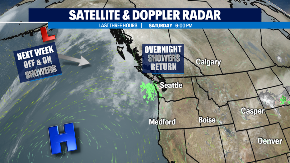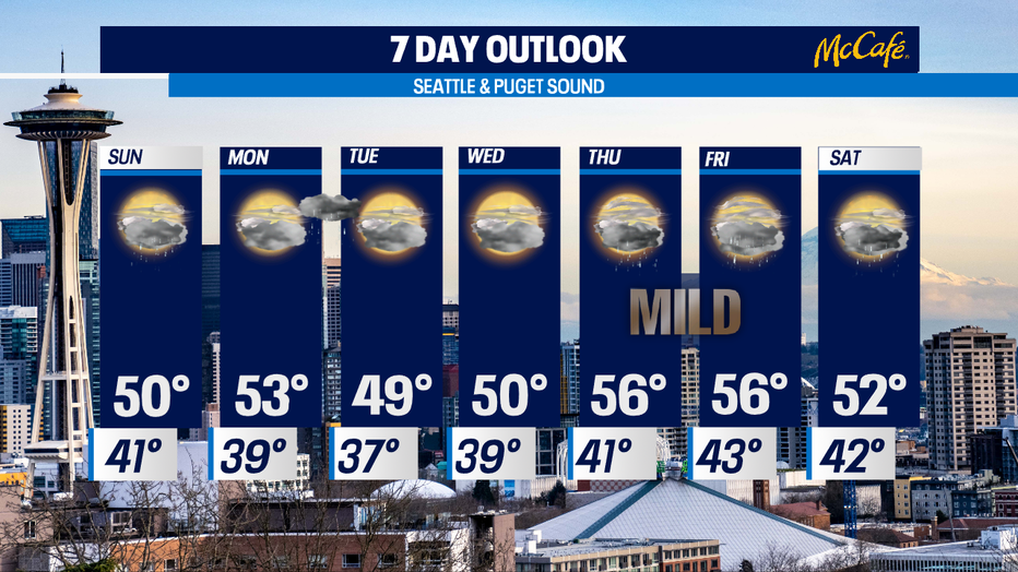Seattle - Showers move in overnight into the first part of Sunday. Not a huge wash out by any means, just traditional winter weather. Light rain will taper off by lunch time Sunday. Highs land near our seasonal average of 51 for this time of year.