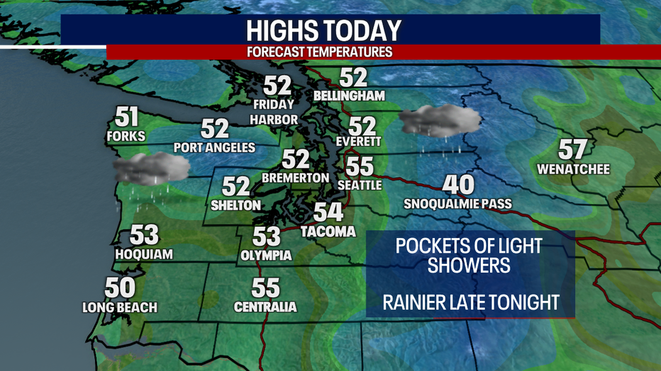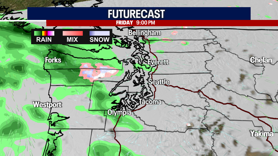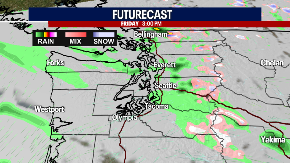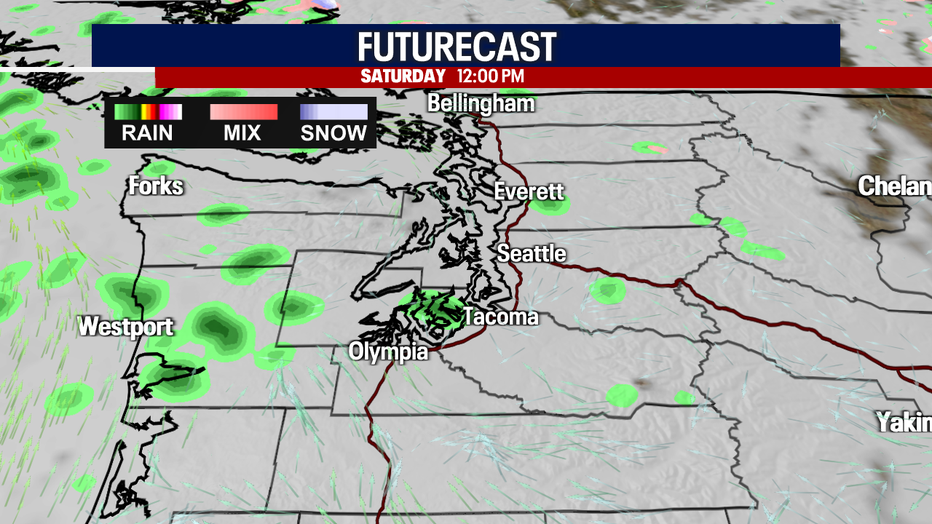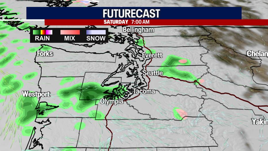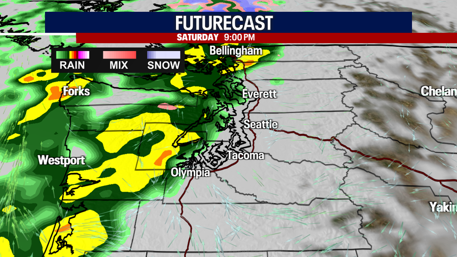 Spotty showers carry us into Saturday. Late Saturday into Sunday morning, a round of drenching rain sweeps through Western Washington. A second batch of soaking rain arrives Sunday night.