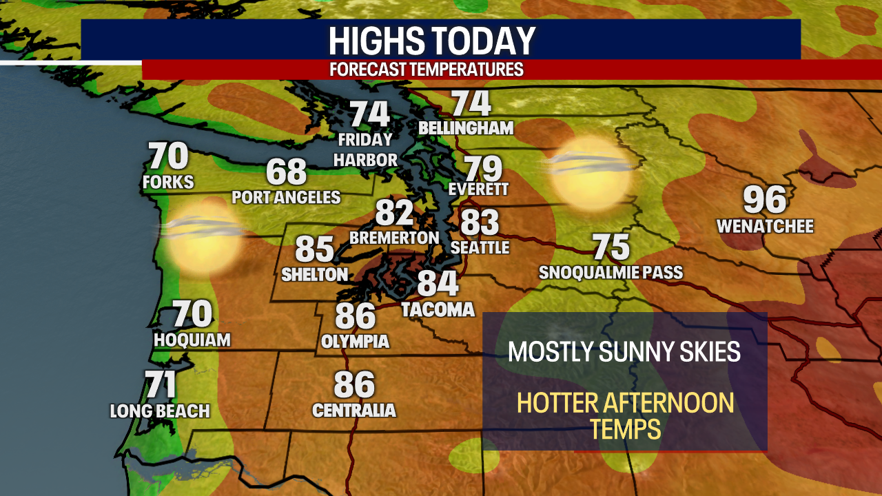 SEATTLE - A ridge of high pressure will continue to build through Saturday, sending temps into the mid 80s for the central and south Puget Sound areas.