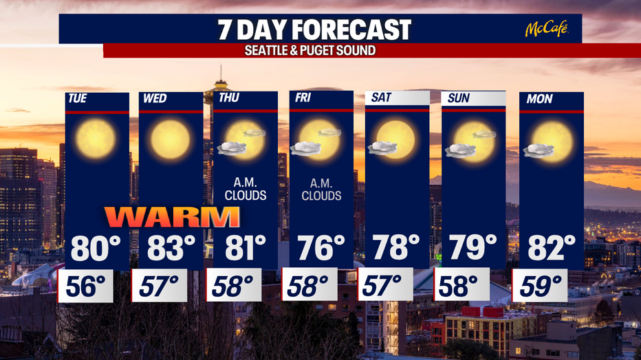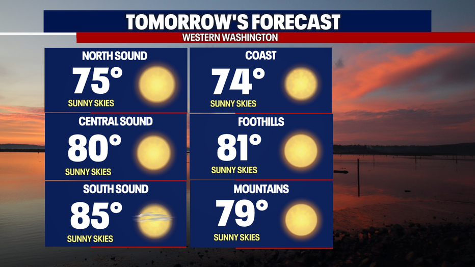 Seattle - Expect a sunny start to the day as temperatures bottom out in the mid-lower 50s. Temperatures will quickly heat up tomorrow, and it'll be a beautiful day to get outdoors and enjoy the day. Take care of your skin as that UV index rises into the high category though! It'll only take about 30 minutes for us to burn.