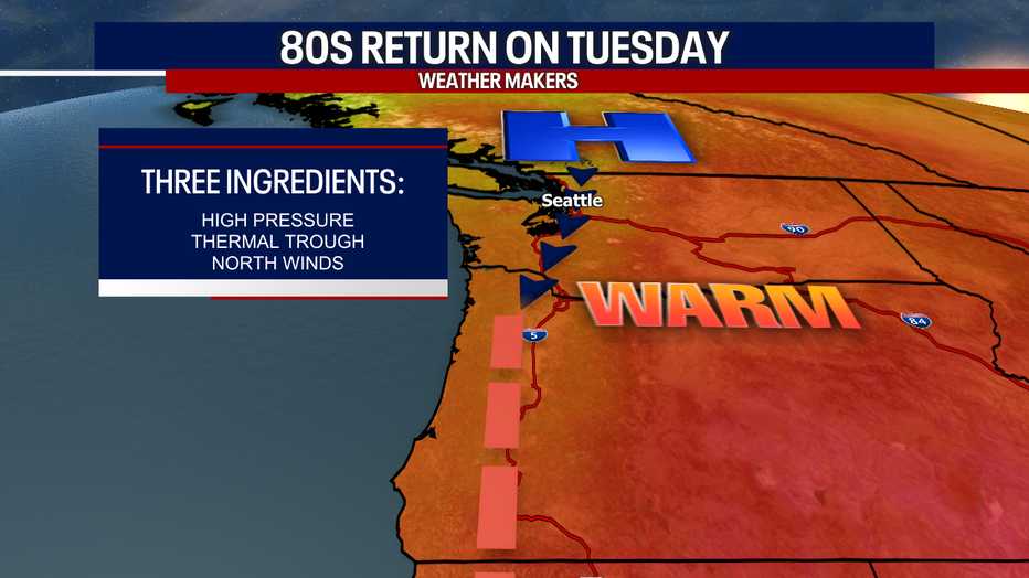 Temps soar into the 80s starting Tuesday due to three ingredients in the atmosphere: high pressure, north winds and what's called a "thermal trough"—corridor of hot, dry air—in Oregon and California. This triad of weather conditions will give our temps a boost. Highs stay in the 80s through Thursday.
