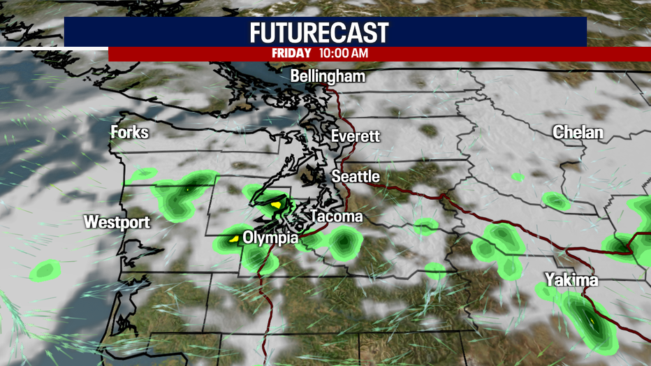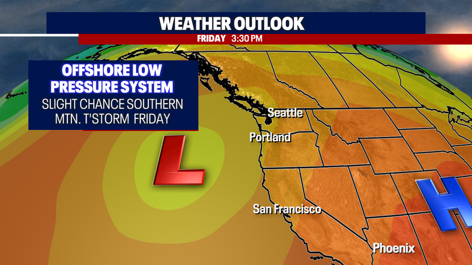As we move into Friday, there's a small chance for a few spotty showers to roll through from the south to the north. Also, the Southern Cascades could see a thunderstorm by the afternoon.