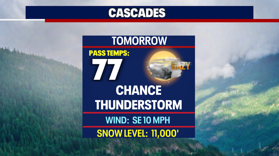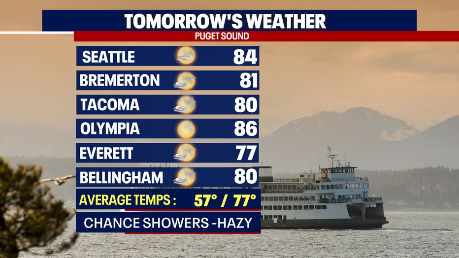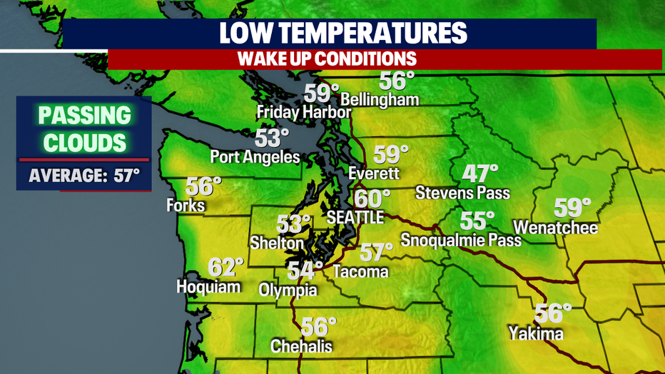 Wake-up temperatures tomorrow sit near 60 for Seattle with a few passing clouds.