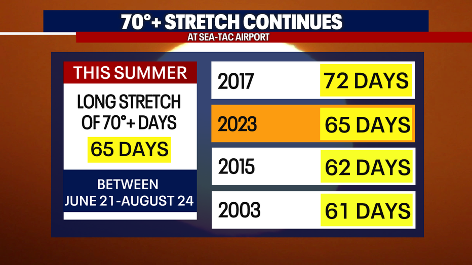 Thursday marks the 65th day in a row that we've seen 70+ temperatures. The longest stretch on record is 72 days set back in 2017.