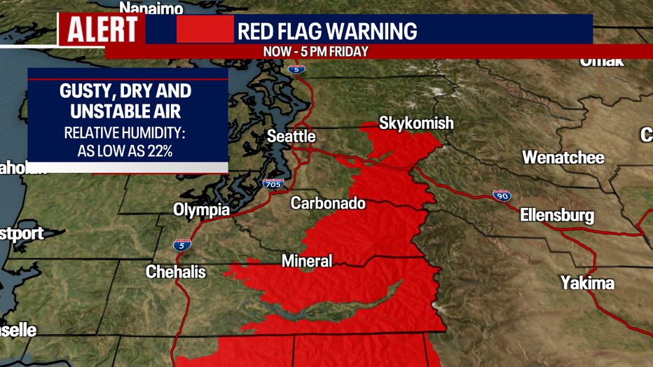 Fire danger is elevated as dry and unstable conditions remain over the Central and Southern Cascades along with gusty outflow winds and relative humidity as low as 22%. A "Red Flag Warning" will remain in effect through 5 p.m. Friday.