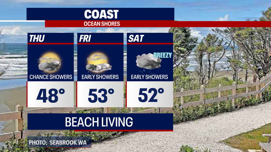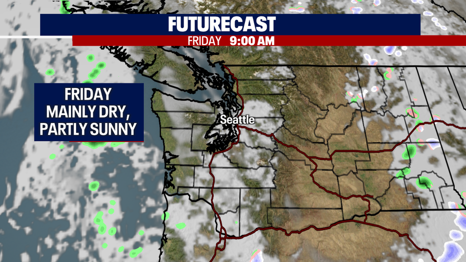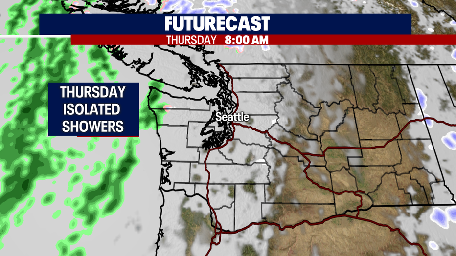 Thursday starts our dry and mostly cloudy, but a weak front will give us a chance for afternoon showers. Highs cool into the low 50s.