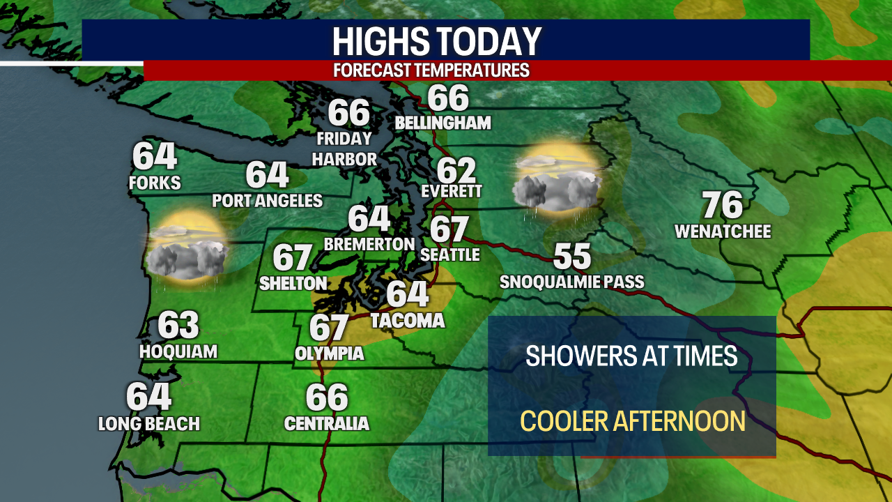 Highs this afternoon will be cooler than average, only lifting to the low to mid 60s around Puget Sound. You can plan on occasional showers along with mostly cloudy skies and slightly breezy weather, too.
