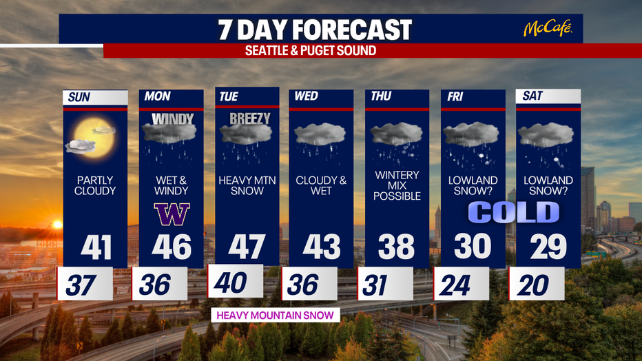 We continue to monitor the potential for lowland snow next week beginning on Thursday. Currently, temperatures are forecast to drop into the 20's. This is still a way out and this forecast is subject to change as we continue to look at the latest forecast models. Stay tuned :-)