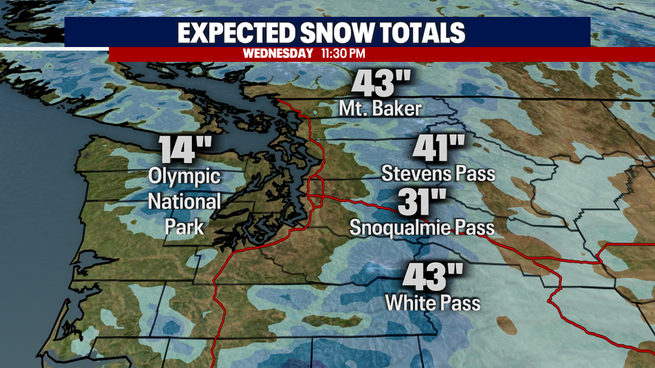 While the lowlands are picking up rain, the mountains will be picking up hefty snow totals. Between Monday and Wednesday, spots may easily see 2-3' of snow.