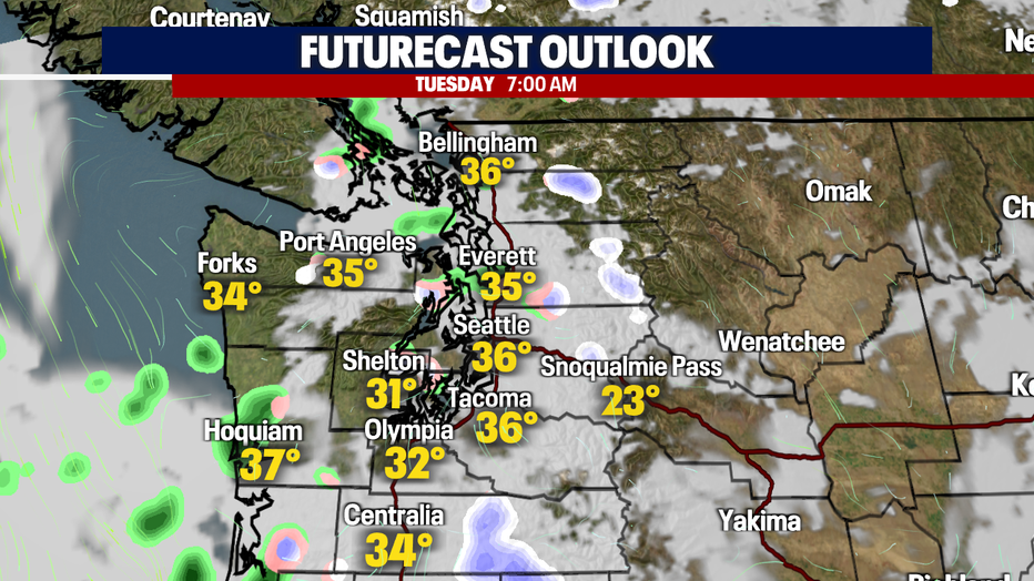 Seattle - Showers will be more isolated as we roll through the evening/night. Temperatures will be cold and remain below normal too - so bundle up!
