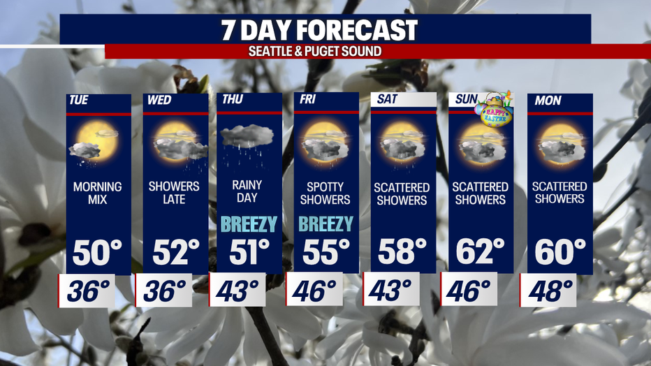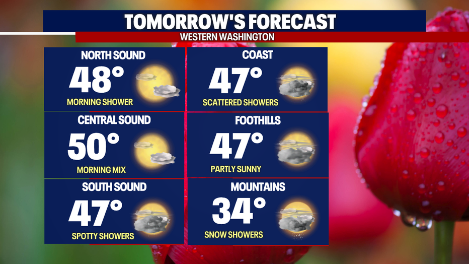 Most of the showers will fade, and we'll get ready for a beautiful, yet chilly, afternoon. Spotty showers will continue and be more likely for those in the Olympic peninsula and the South Sound. Snow showers will be continuing for those in the Cascades and Olympics too. There are now alerts for the mountains. Here is a look at your afternoon forecast: