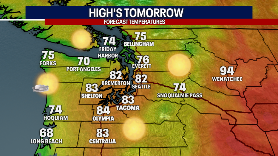 Temperatures will fall into the 50s for most locations tomorrow morning. Our normal overnight low this time of year is 58 degrees, so we'll be slightly below that at Sea-Tac (56 degrees).