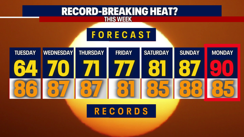 After tomorrow, temperatures begin to soar! It's looking like a beautiful work week, but by the weekend, it's going to be HOT. It's looking like record-breaking heat too! If you're making any Mother's Day plans, plan on cool locations. Here is a look at your temperature trend through the week: